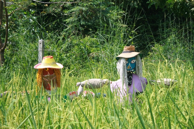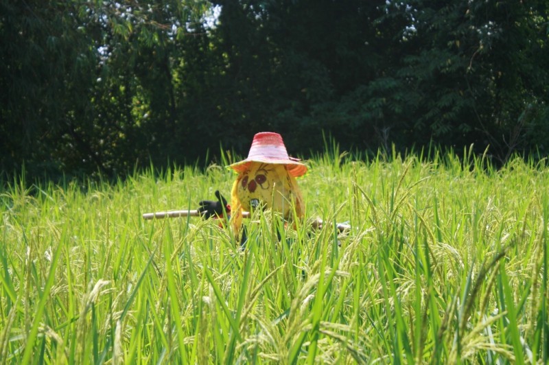White Water Lake, a short distance from the resort, where there are hundreds of birds, including spotted doves and other small birds that love rice. Scarecrows are a natural way of discouraging birds from eating the grains without doing them any harm. It takes about a month after the first flowers emerge for the rice to ripen and guests will also be invited to take part in the rice harvest at that time, which is expected to be in early December.
