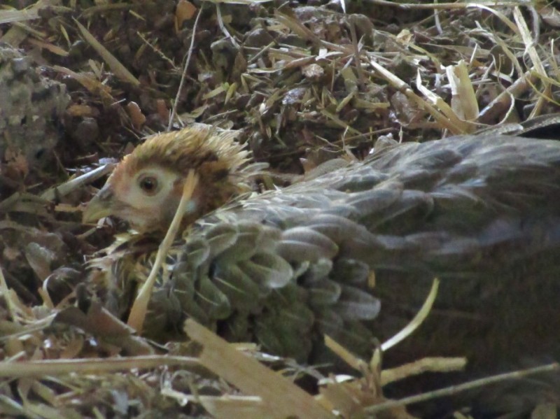 Red jungle fowl from Southeast Asia are said to be the ancestors of modern domesticated chickens and are much the same as they have been for thousands of thousands of years. While having some similarities to domestic birds, they do have important differences. Apart from being good fliers, they are smaller and leaner and the features seem more like a pheasant than a chicken. The females only have rudimentry combs and hold their tails horizontally. Valentina fits these descriptions so perhaps she is close to being a pure breed. The male is just now getting a white tuft under his wattles which suggests he is quite close to the original variety too.